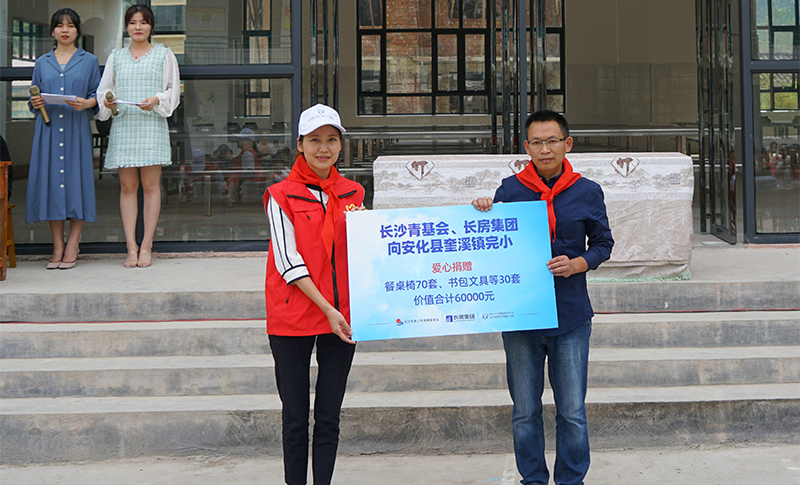 “金色的駝鈴,叮當(dāng)叮當(dāng),小駱駝帶著它走向遠(yuǎn)方,追趕著春天的腳步叮當(dāng),走向綠色的希望?!敝赡矍宕嗟母杪曉诎不h奎溪鎮(zhèn)完全小學(xué)校園里響起,融化著眾人的心。2019年9月25日,長沙青基會與長房集團(tuán)共同舉行的“大愛奎溪完小、情暖校園食堂”愛心餐桌椅捐贈儀式在安化縣奎溪鎮(zhèn)完小舉行。儀式現(xiàn)場,長房集團(tuán)“藍(lán)絲帶”愛心傳遞基金向?qū)W校捐贈了70套餐桌椅,并給學(xué)校30名貧困學(xué)生帶來了書包、文具等新學(xué)期禮物,本次愛心捐贈價(jià)值60000元。長房集團(tuán)黨群工作部負(fù)責(zé)人,長沙市青少年發(fā)展基金會辦公室負(fù)責(zé)人,長房集團(tuán)十余名青年志愿者,安化縣教育基金會、奎溪鎮(zhèn)政府、奎溪鎮(zhèn)中心學(xué)校的領(lǐng)導(dǎo)及奎溪鎮(zhèn)完小師生代表出席了捐贈儀式。