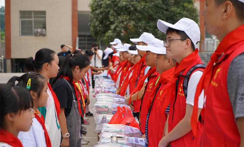志愿者給貧困學(xué)生送上書包等文具